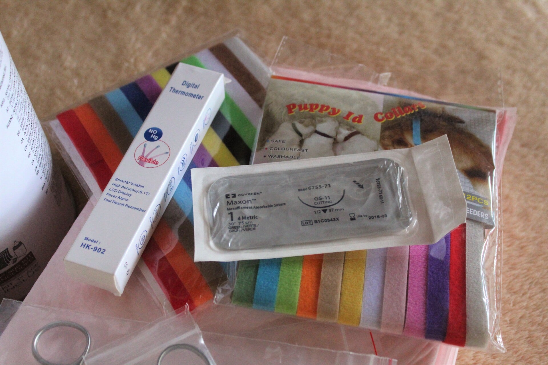 Foto 2: roze onderleggers, puppybandjes (om de pups uit elkaar te houden), thermometer, hechtdraad (om naveltjes mee af te binden als deze te kort zijn afgebroken, puppymelk, ontwormingsmiddel, 1 navelstrengschaartje, 2 kochers
