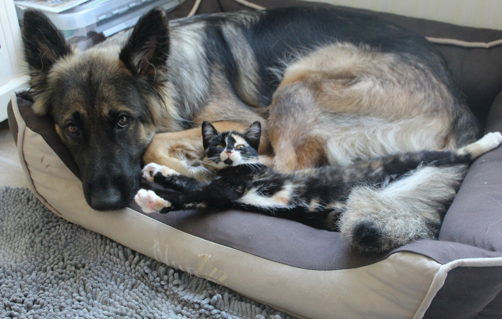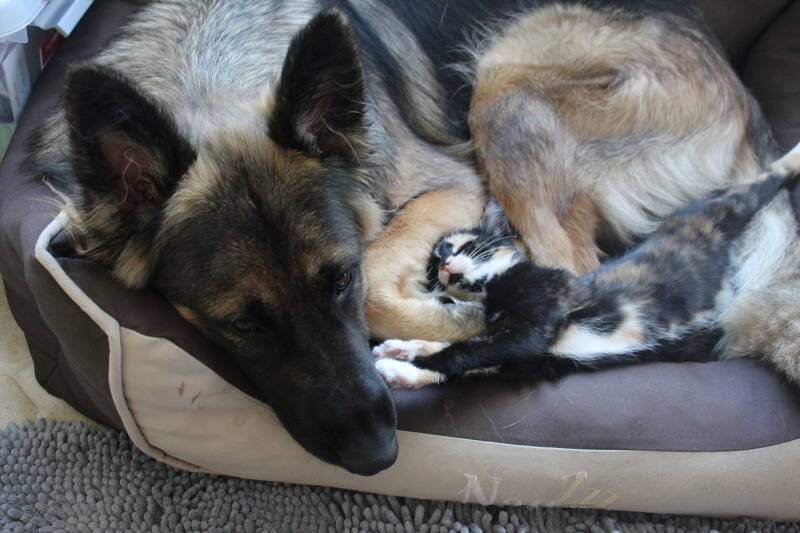 Sinds 10 juni hebben we er een huisdier bij! Een poes, ze heet Coosje! Norah en Coosje kunnen het goed vinden, af en toe slaapt Coosje zelfs bij Norah in de mand!
