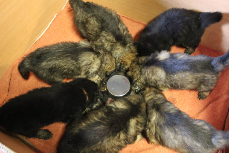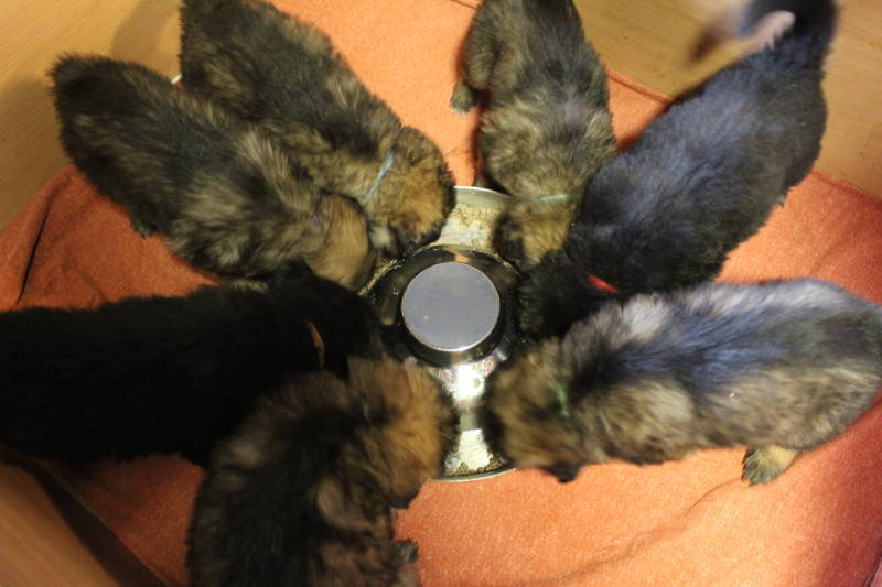 En de pups aten weer pap! Nu gemalen brokken gemengd met water. Het was al heel snel op.