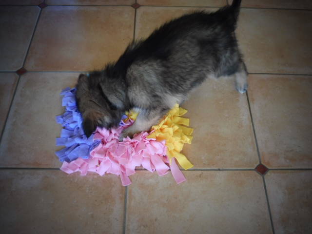 Het baasje heeft iets heel leuks voor mij gekocht. Een matje waarin je voer kunt verstoppen! Ik moet het opzoeken met mijn snuit en dan kan ik het opeten. Dankjewel baas!
